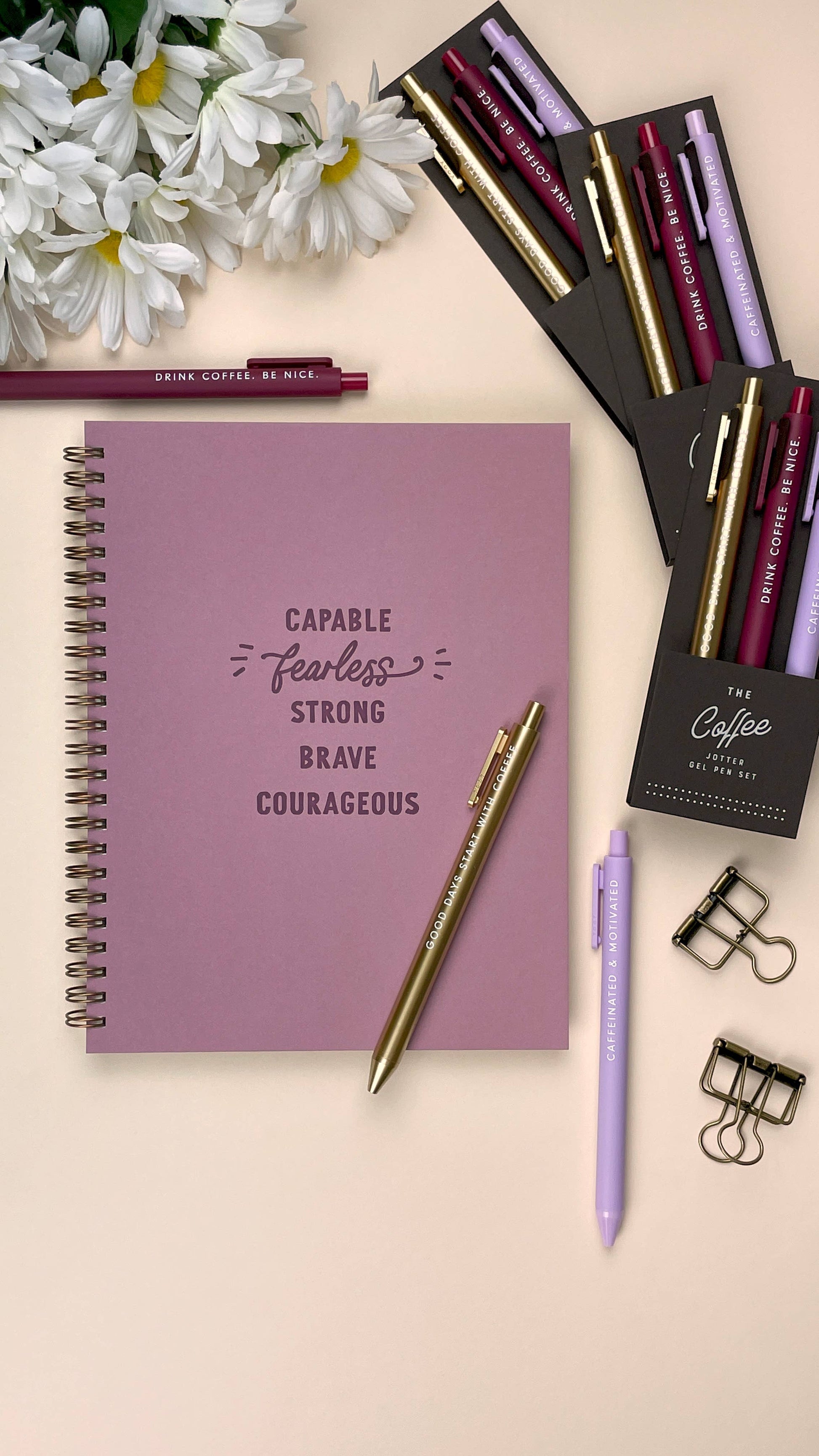 A pen set designed for people who are already on their fourth cup of coffee today. The perfect pens to use while sipping your cup of coffee and writing down your next great idea. These colorful jotter-style pens are designed with phrases inspired by coffee lovers. This pen set is also the perfect stocking stuffer, graduation present, birthday gift, and more!