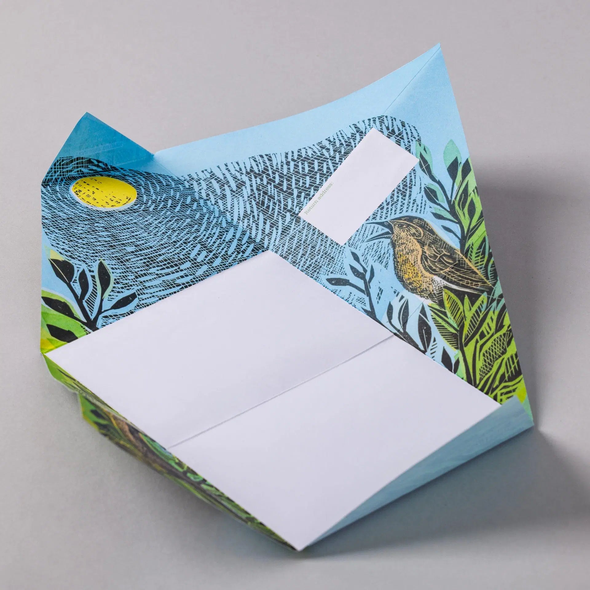‘The flick-flack-floosh of our letterbox announcing we have post is a great sound. These days letters are few and far between, so when a beautiful bright pigeon from John Morse-Brown arrived it was a joyous moment. He had written to ask if I would like to do some design work (I’ve never been asked by post before!) – how could I resist? That was last summer and it did take longer than I expected as I had to cut 12 blocks but it is wonderful to be part of the pigeon stable (or should that be loft?) I hope you enjoy this collection of wild designs – an apt title for an illustrator inspired by nature.’ Angela Harding.