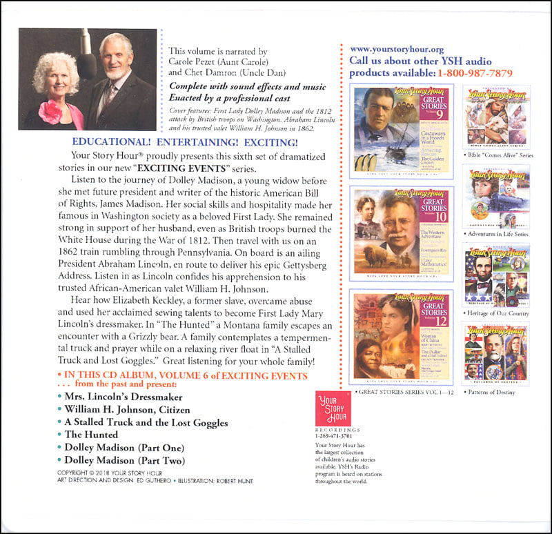 Exciting dramatized stories about: First Lady Dolley Madison; Elizabeth Keckley, Mrs. Lincoln's dressmaker; William H. Johnson, Abraham Lincoln's trusted valet; and two true-to-life adventures! (Album Details: 3 CDs / 6 MP3s; Each episode is ~30-mins; Narrated by Uncle Dan & Aunt Carole; Cover art direction & design by Ed Guthero / Illustrated by Robert Hunt)